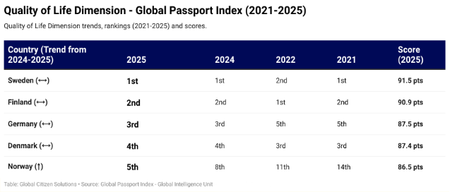 Global Citizen Solutions (“GCS”), a leading advisory firm in citizenship and residency planning, has released a new briefing presenting the full findings from the ‘Quality of Life’ dimension of its Global Passport Index (GPI). As quality of life becomes a decisive factor in relocation and long-term residency decisions, GCS ranks more than 180 countries based on their attractiveness as places to live and assessing the conditions offered by the country to which a passport connects its holder.