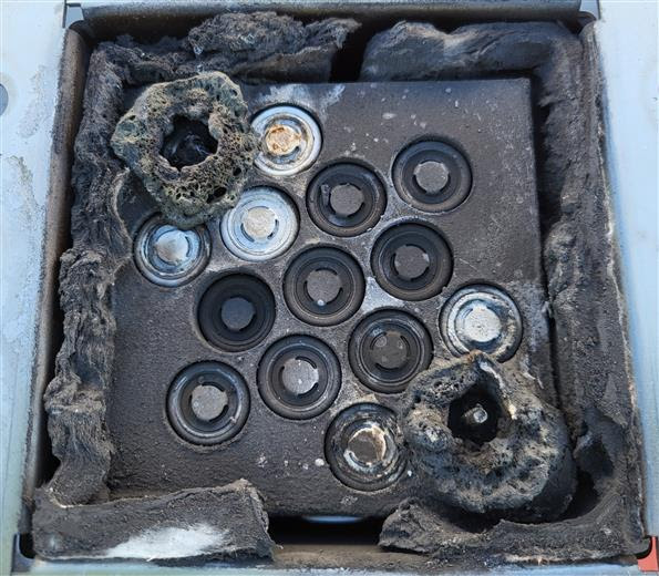 Same battery cell module after thermal runaway test with evidence of no propagation from trigger cells (top left cell and bottom right cell) to neighboring cells